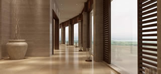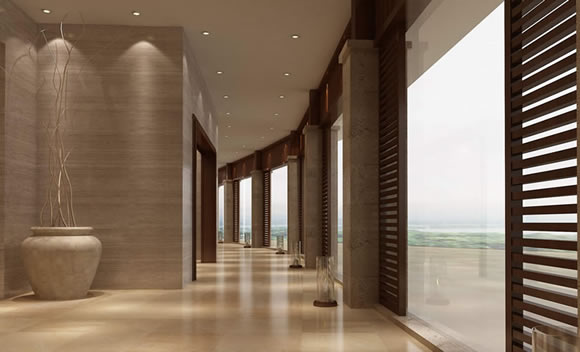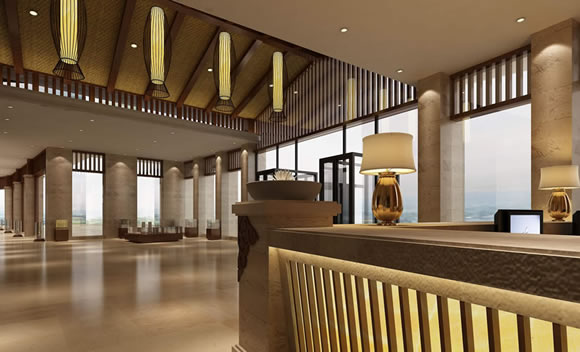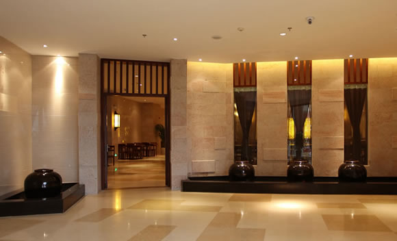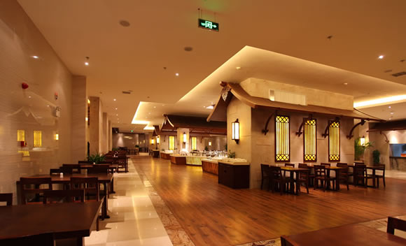 酒店公共部分的空间设计追求酒店的度假感,手法运用了大理的山花和木雕以及石材等。在餐厅中运用室内的坡顶建筑来处理排烟风井。